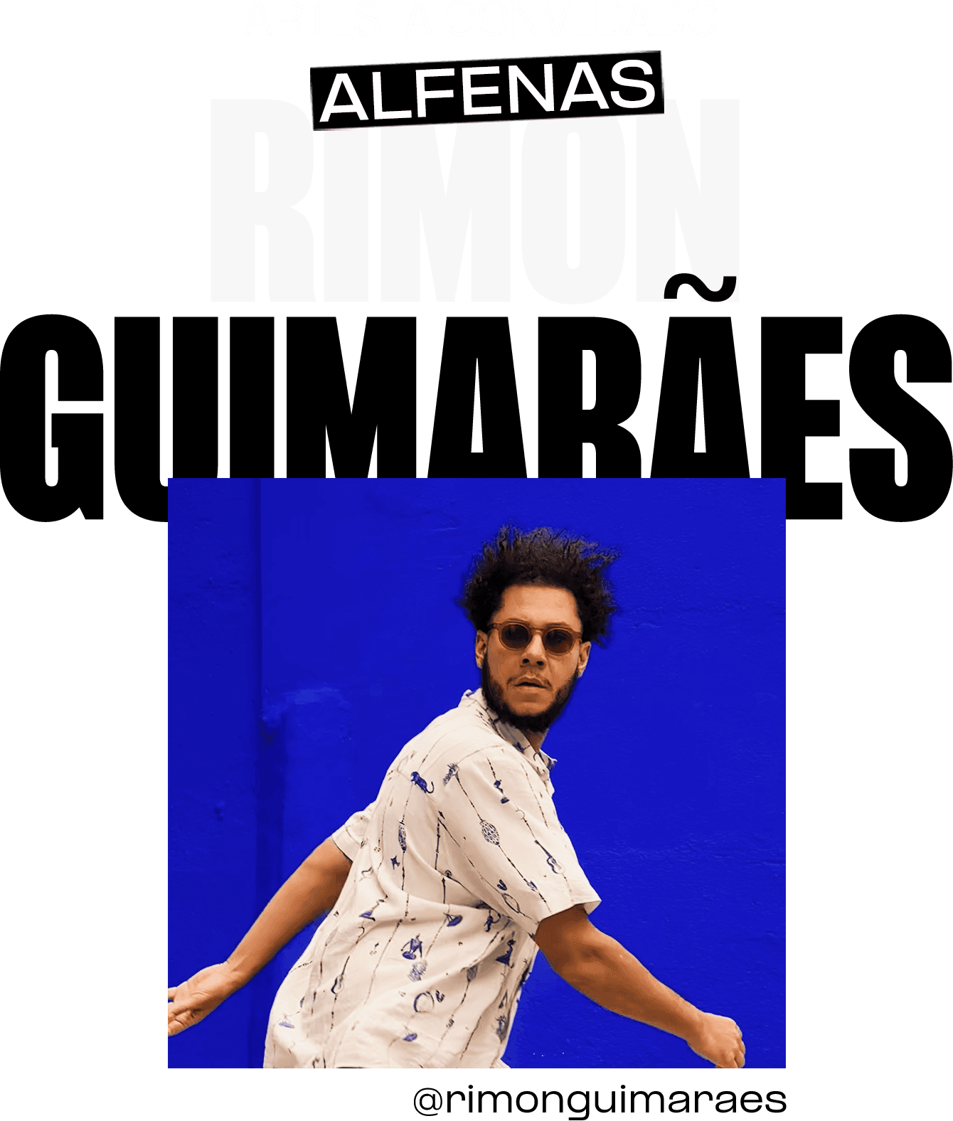 Nascido em Curitiba (PR), Rimon Guimarães é artista autodidata e multidisciplinar, convidado do projeto na etapa de Alfenas. Busca por meio de vivências, viagens e trocas culturais transmutar o espaço-tempo, produzindo obras que dialogam com a acessibilidade das informações e das mídias contemporâneas. Suas criações abrangem murais de larga escala, pinturas, desenhos, gravuras, fotografias, vídeos, instalações, performances, composições e áudio. Realizou trabalhos em países como Gâmbia, Malásia, Itália, Holanda, Alemanha, Dinamarca, EUA e Argentina, além de diversas cidades do Brasil.
